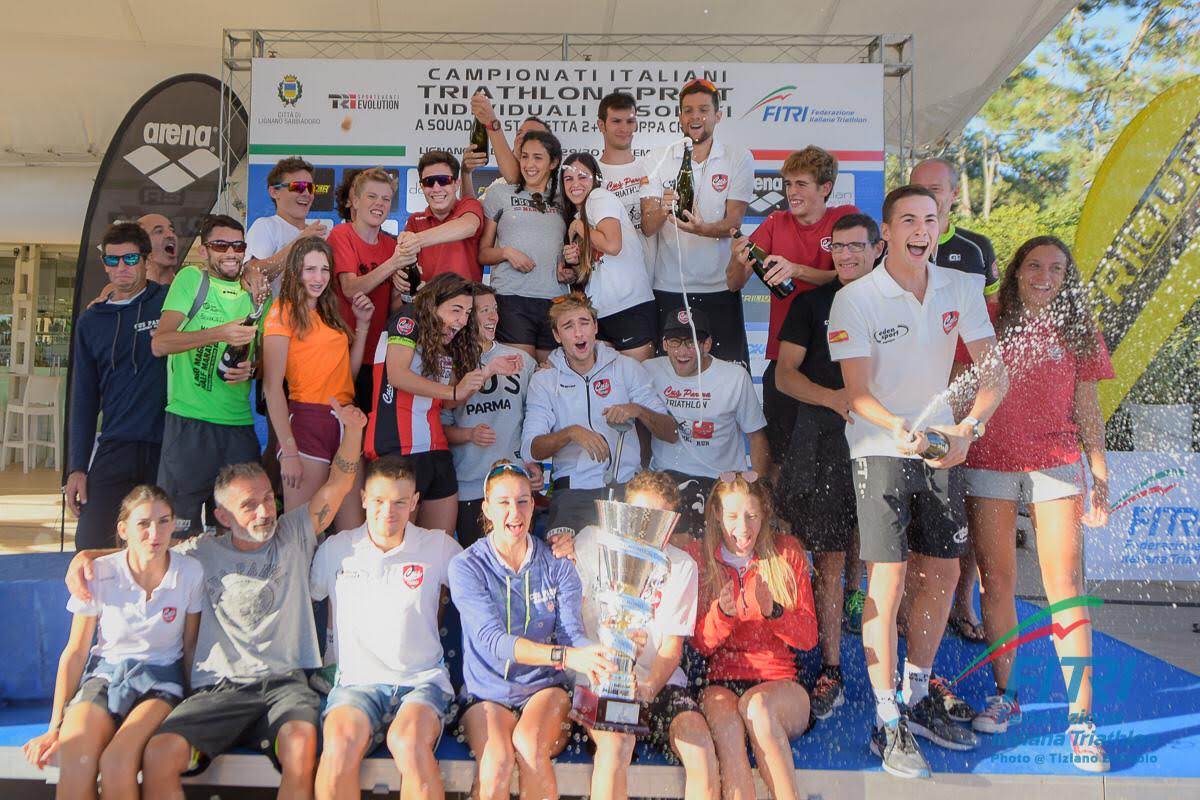 Un trionfo storico quello firmato CUS Parma Triathlon che si aggiudica la prima edizione del trofeo Coppa Crono staccando nettamente la seconda squadra classificata e superando centinaia di società provenienti da ogni parte d’Italia. Il nuovo circuito voluto dalla Federazione Italiana Triathlon si è composto da due tappe in cui gli atleti hanno gareggiato in cronosquadre composte da un minimo di tre a un massimo di cinque componenti. Dopo il successo di Caorle (VE) in febbraio, tappa riservata al duathlon, è arrivato il successo anche nell’ultima tappa andata in scena a Lignano Sabbiadoro (UD) dove il CUS Parma Triathlon ha gareggiato con ben 3 formazioni maschili e 2 femminili che hanno ben figurato ottenendo tanti punti che hanno permesso alla società di assicurarsi il trofeo! Il migliore risultato è sicuramente il bronzo maschile di un team ormai ben collaudato composto dagli U23 Matteo Morelli, Nicola Scarica, Federico Pezzani e Nicola Grisenti che hanno dovuto arrendersi solo nel finale a Spezia Triathlon e Liger Keyline. Queste le loro parole: “Siamo davvero soddisfatti di questo risultato perchè riconfermarsi sul podio della cronsquadre di triathlon non è stato facile anche a causa del recente infortunio del nostro compagno di squadra Grenti che ha dovuto alzare bandiera bianca. Ora ci godiamo per qualche giorno questa storica vittoria e poi ci prepareremo per gli ultimi appuntamenti agonistici della stagione dove cerchermo di rendere ancora più dorata questa stagione assieme agli allenatori e a tutti gli sponsor che ci supportano: Parmigiano Reggiano, Conad, Sessantallora, Eden Sport, CMC, AdvancedPro, Gioielleria Bolzoni, MRSport.”