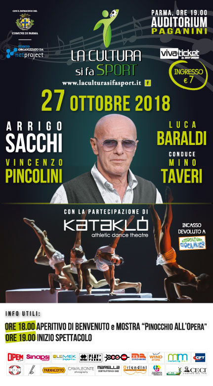 Sabato 27 ottobre alle ore 19.00 all’Auditorium Paganini si parlerà di educazione allo sport, famiglia e sport giovanile insieme al grande Arrigo Sacchi, Vincenzo Pincolini e Luca Baraldi. Un talk show di grande interesse perché toccherà aspetti che coinvolgono ogni famiglia che intende accompagnare i propri figli nel percorso delle competizioni sportive. La Cultura si fa sport 2018 è inoltre entusiasta di ospitare per la prima volta la straordinaria compagnia di danza acrobatica Kataklò che incanterà il pubblico con lo spettacolo Play, portato inscena alle Olimpiadi di Pechino 2008. Ma non finisce qui, a partire dalle ore 18.00 per tutti i partecipanti degustazione GrandCru Parmacotto e Spumante di Lambrusco BRUNO di Cantine Ceci e un magico viaggio per adulti e bambini dentro alla mostra “Pinocchio all’Opera” by Sinapsi Group alla scoperta di tutti i personaggi e i segreti dell’Opera lirica. La tua presenza sarà preziosa in quanto il ricavato della serata verrà devoluto all’Associazione Giocamico che opera presso l’Ospedale dei bambini di Parma.