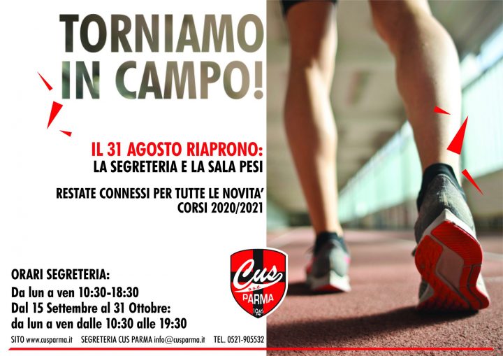 Parma, 20 luglio – Si torna in campo: via libera al calcetto nei campi Cus Parma. Seguendo l’ultima direttiva regionale, il Centro Universitario Sportivo cittadino riparte con le prenotazioni dei campi sintetici 10 e 11 all’aperto. Gli spogliatoi rimarranno chiusi al pubblico. Le prenotazioni sono valide solo se effettuate telefonicamente al numero 052190553. Si richiede…
