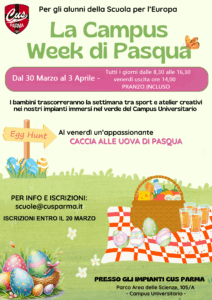 La CAMPUS WEEK DI PASQUA del Cus Parma è pronta ad accogliere i nostri piccoli ospiti per una settimana speciale all’insegna dell’allegria, del movimento e della creatività.